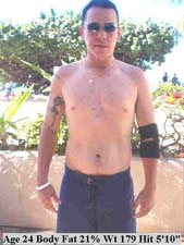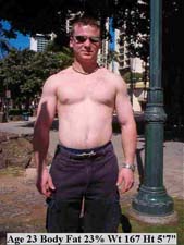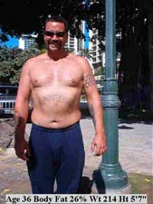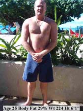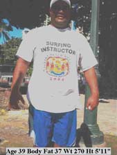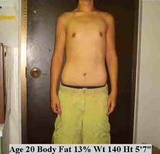 This individual like most bodybuilders, believed he had low body fat because of "definition." But this is simply muscle "pushing through" layers of body fat. Body builders also need to consider total weight to assess their level of leanness. 50 extra pounds will add too much body fat even if 10-12% is the total body fat level. We must consider normal weight-height ranges along with the body fat percentage. |