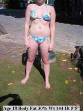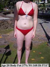 | The above female though young has a high body fat level and she's heading for obesity. Appearance can be misleading because as muscle turns to fat overall body size may not look different. Fat is stored internally. Muscle turns to body fat and fat deposits in both muscles and organs. This is called "visceral fat" and the crowding internally begins the changes that will soon lead to disease, debilitation and more obesity. |