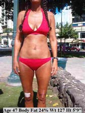 Tatianna had been doing strenuous weight work and aerobics while restricting calories and could not eliminate her excess body fat, here shown at 23%. She was told to stop doing aerobics and limit weight work to very light weights and short routines. She had no fatigue, hunger, moodiness or anxiety on the "Lean Gene Diet." |